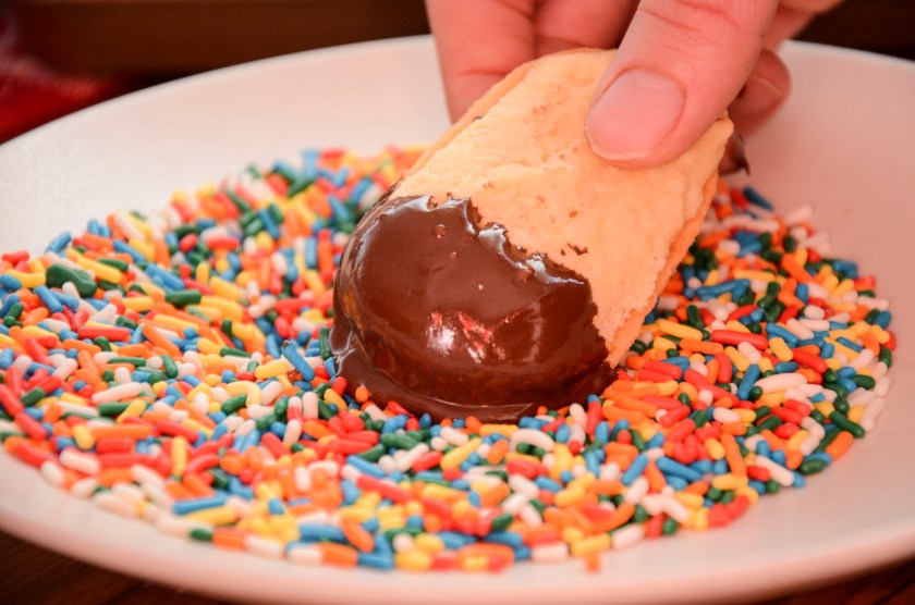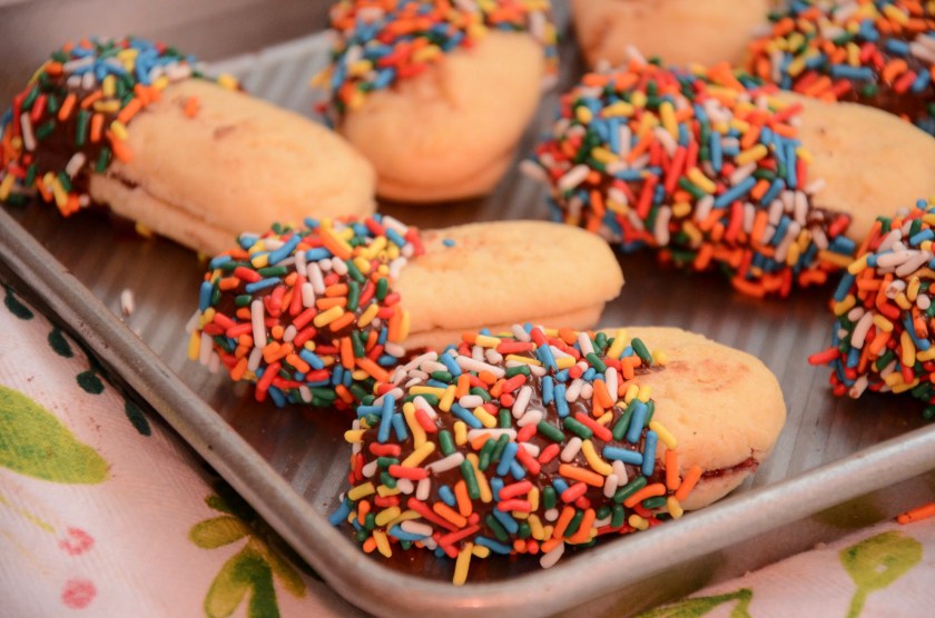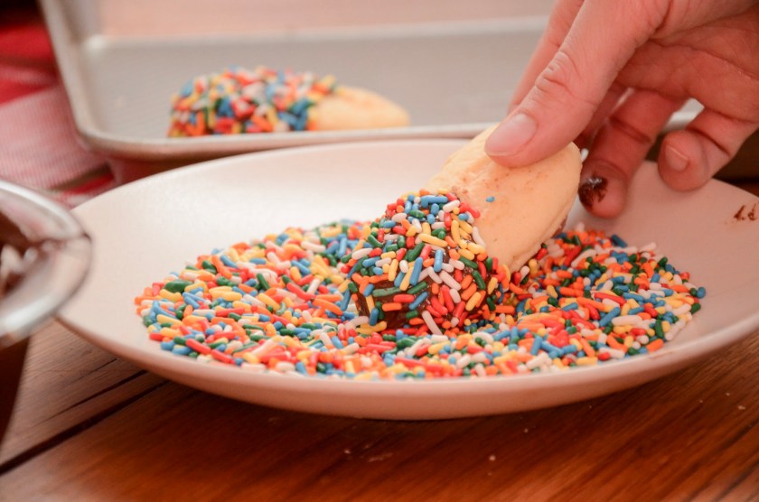 These are the kind of cookies that remind me of a few things. They’re the kinds of cookies in a mixed assortment from a bakery (or from the supermarket bakery section) that maybe aren’t your first choice now but as a kid you went for because they were essentially two cookies for the price of one and covered in chocolate and sprinkles. They’re also another cookie that reminds me of my dad, because God forbid my mother walked into a bakery for cookies…