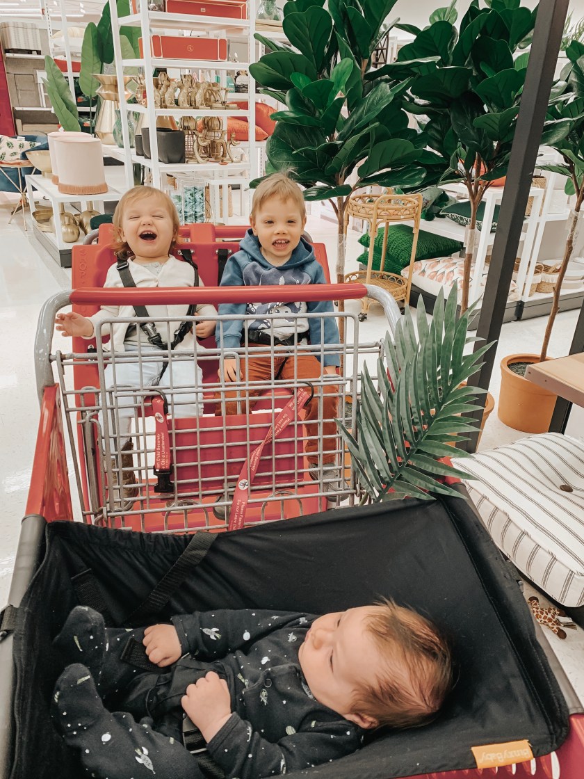 I also come prepared with snacks for the kids and a list because honestly going to the store has to be in and out – no browsing is happening with three babies!