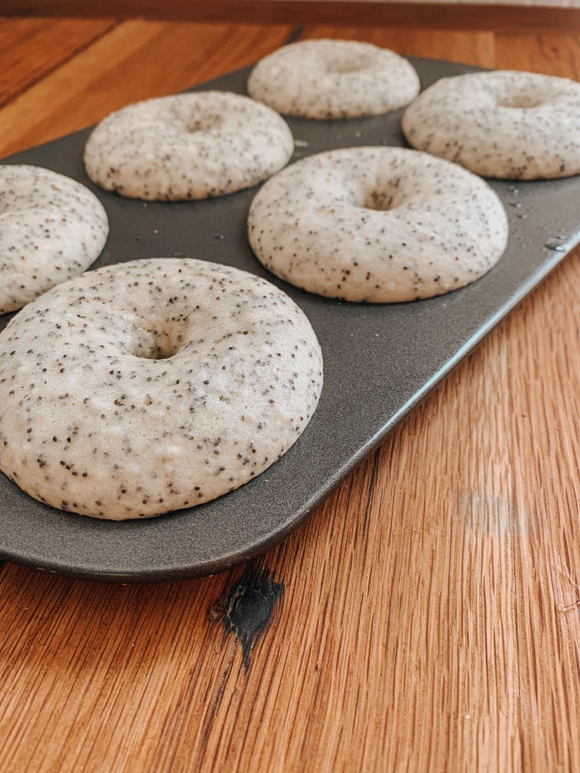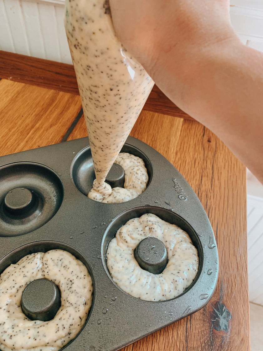 Pro tip: use a piping bag or a gallon bag with a corner shipped off for easy donut pan filling.